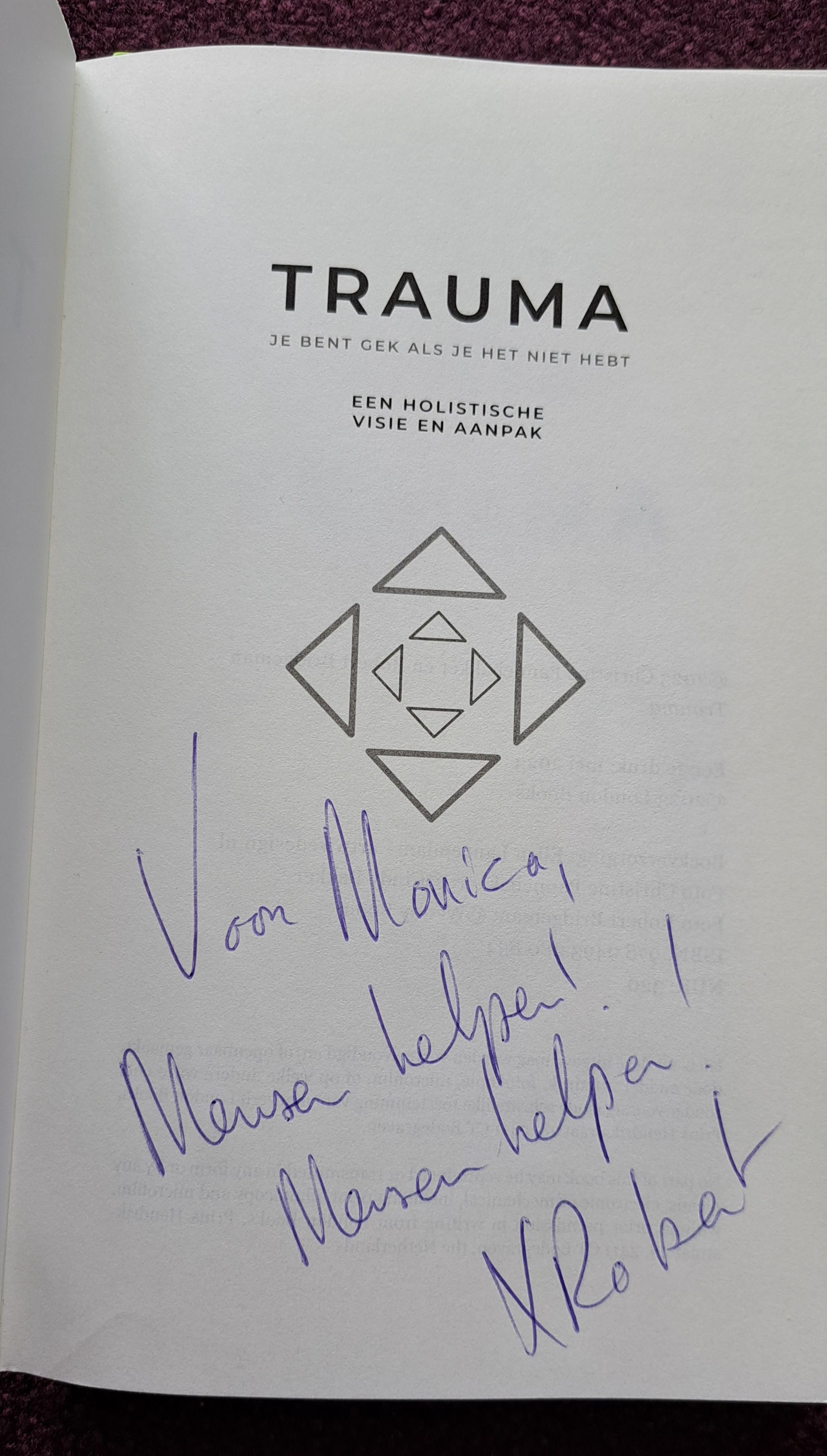 Het nieuwe boek van Robert Bridgeman “TRAUMA, je bent gek als je het niet hebt” heb ik gekocht die hij signeerde met hetgeen wat in hem op kwam: “Voor Monica, Mensen helpen! Mensen helpen! X Robert”. Wouw! Het ontroert me gewoon! Mooier en krachtiger had niet gekund. Het steunt me om verder op mijn bijzondere reis te gaan en te gaan doen wat ik graag wil doen, met mijn licht, liefde en warmte ‘Mensen helpen!’…